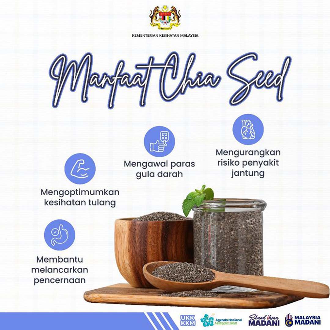• Mengawal Berat Badan: Serat dan protein dalam chia seed membantu memberikan rasa kenyang, mengurangkan pengambilan kalori, dan seterusnya membantu dalam program penurunan berat badan.