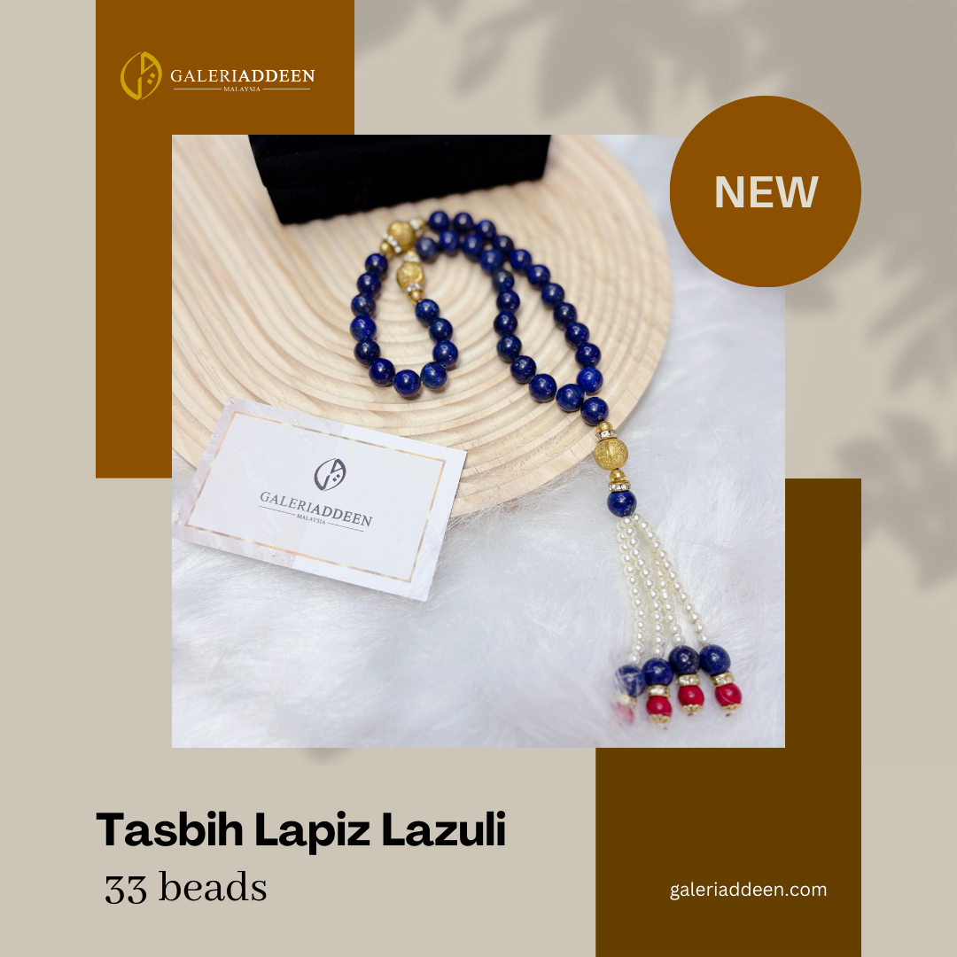 Tasbih Lapiz Lazuli ialah batu berwarna biru yang sangat ekslusif dan akan membuat si pemakai nampak berseri dan cantik. Ia diperbuat daripada 100% Natural Stone. Tasbih Lapiz Lazuli mempunyai 33 biji. Sesuai untuk dibuat sebagai hadiah ulang tahun, ulangtahun perkahwinan dan majlis perkahwinan. Batu Lapiz Lazuli dikatakan mempunyai banyak manfaat dari segi rohani.
